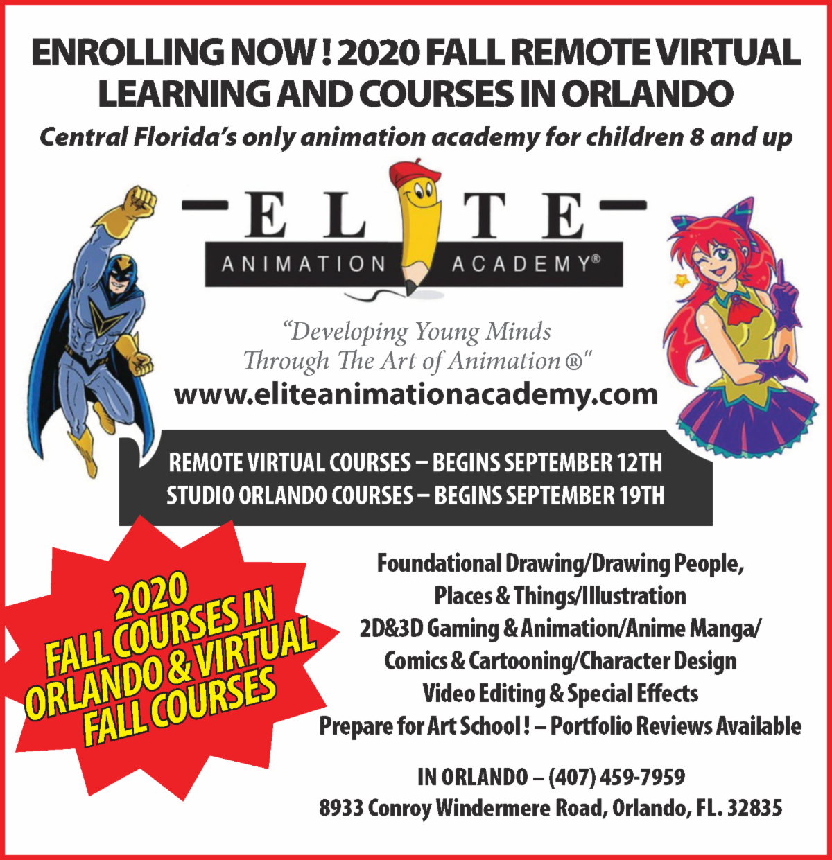 2018 COURSES STARTING NEXT SATURDAY - JANUARY 6th ! GET TO KNOW ELITE ANIMATION ACADEMY ! CLICK ON VIDEO BELOW CLICK TO BOOK ONLINE MONTHLY PAYMENT TUTION PLANS AVAILABLE SAVE $75 WITH FULL TUITION PAYMENT USE PROMO CODE - "FULL-PAYMENT" AT CHECK OUT IN STUDIO - ORLANDO and TAMPA Saturday's - 10 am to 6 pm January 6th, 2018 to March 10th, 2018 VIRTUAL COURSES AFTER SCHOOL - VIRTUAL - (Once per week) Tuesday's - Friday's 4:30 pm to 6:30 pm January 9 th , 2018 to March 16, 2017 ALL NEW COURSES FOR WINTER 2018 Anime-Manga Foundational Drawing II* 2D Animation II* Cartooning and Comic Books Human Anatomy (Life Drawing) 3D Game Development Management reserves the right to modify this schedule at any time, or cancel classes for unforeseen circumstances or in studio classes with fewer than 4 registrations. Students will be notified at least 12 hours prior to class time and refunds will be processed. *Requires the prerequisite Foundational Drawing 1 and 2D Animation I . "Developing Young Minds Through the Art of Animation®" |